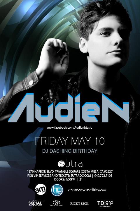 One of my favorite upcoming producers in Audien will be making his way to Sutra this Friday, May 10. The Connecticut native Nate Rathburn has been behind some hit tracks such as “Wayfarer“, “Eventide“, “Unity“, and as well as his remix of “Timebomb“. Whether you like trance or progressive house, Audien will be sure to have a set that will get you and the crowd going. Doors open at 9pm at the Costa Mesa club and it’s 21+ to get in.
