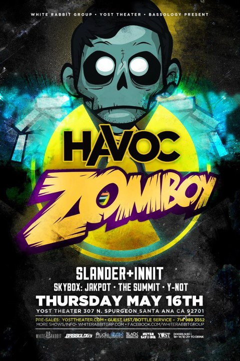 This Thursday, May 16, Zomboy will be playing at the Yost Theater in Santa Ana as part of the weekly Havoc Thursdays series. SLANDER and Innit will be playing alongside Zomboy with Jackpot, The Summit, and Y-Not in the Skybox Lounge. White Rabbit Group, Yost Theater, and Bassology are hosting the show which will be give you all the dubstep and trap you can handle. Doors open at 10pm for the event and it is 18+ to get in.