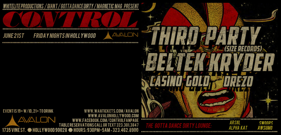 As part of Avalon Hollywood’s C0ntrol Friday’s, a trio of Third Party, Beltek, and Kryder will descend upon Los Angeles for a night of dancing this Friday, June 21. Third Party is the duo behind one of my favorite progressive house songs in “Lights” a collaboration with Steve Angello. Beltek is the guy who produced “Connect Us”, which has made its way around many sets the past couple months. Kryder spiced up and gave a big room sound to Sting and The Police’s “Sending Out An S.O.S.”
