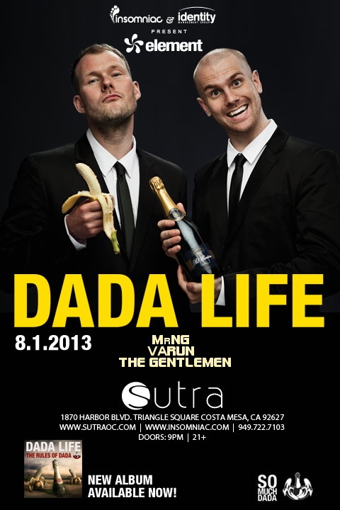 Are you ready to get bananas?!?! Tomorrow on Thursday, August 1, the one and only Dada Life will be invading Sutra in Costa Mesa for a champagne and banana filled night. Known for massive tracks like “Kick Out The Epic Motherfucker”, “Rolling Stone T-Shirt”, “Happy Violence”, “Feed The Dada”, and “Cookies With A Smile”, I can say from personal experience that these guys know how to throw a party. Tickets are at the last tier of $50 right now and are on the verge of selling out. The show is 21+ and doors open at 9pm.