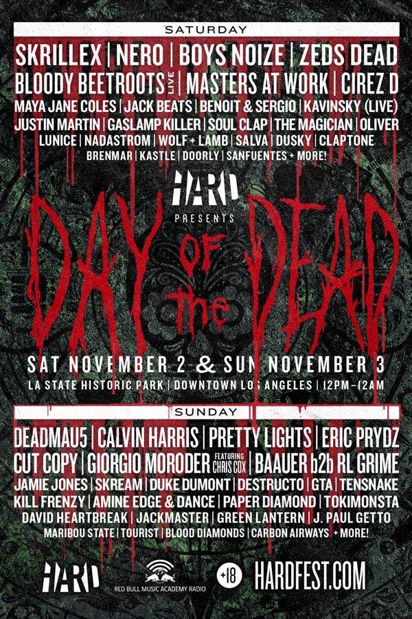 I know the Hard: Day of the Dead line up was announced Wednesday, but it’s taken me two days to get my jaw off the ground after I saw this massive list. The two day post-Halloween festival will be taking place at the Los Angeles State Historic Park on Saturday, November 2 and Sunday, November 3 from 12 pm till 12 am. Saturday’s headliners include Skrillex, Nero, Boys Noize, Zeds Dead, Bloody Beetroots, Cirez D, and Jack Beats. Sundays line up will consist of deadmau5, Calvin Harris, Pretty Lights, Eric Prydz, Giorgio Mororder, and Bauuer b2b RL Grime. And that’s just a taste of what’s to come.