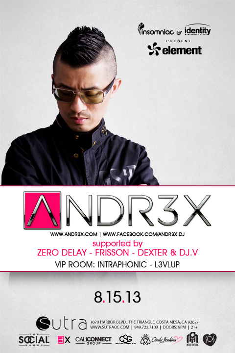 Coming up this week at Sutra, resident DJ Andr3x will be headlining the night as part of Insomniac’s Element Thursdays. Along side Andr3x will be crowd favorites Zero Delay, Frisson, and Dexter & DJ.V. After sharing the stage with Armin van Buuren, Ferry Corsten, and most recently Above & Beyond, Andr3x will be sure to keep the energy high as he plays to the crowd. The VIP Room will consist of Intraphponic and L3vlup. I’ve heard some amazing sets from And3x, Frisson, and Zero Delay last time around, so I know these guys (and girl!) can definitely bring it. RSVP ahead of time and get free entry from 9pm till 10:30pm. If you arrive later than that, tickets will be available for $20.
