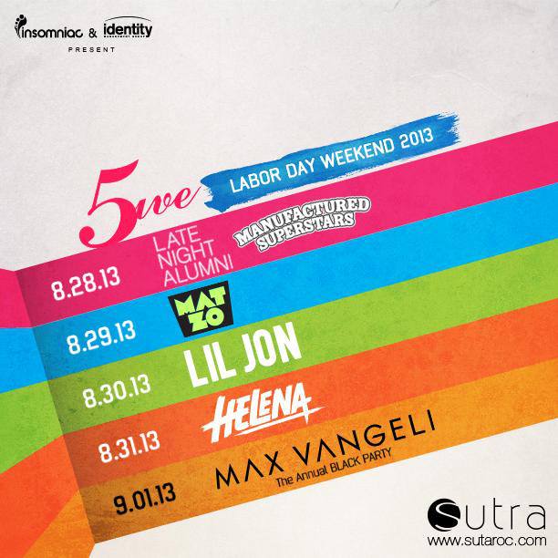 Sutra5 – Labor Day Weekend featuring Late Night Alumni, Manufactured Superstars, Mat Zo, Lil Jon, Helena, and Max Vangeli