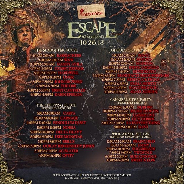 Earlier today, Insomniac announced the set times for the 2013 Escape From Wonderland festival. Taking place this weekend on Saturday, October 21 at the San Manuel Amphitheater and Grounds, the event goes from 4pm till 2am and features some of the best artists from around the globe.