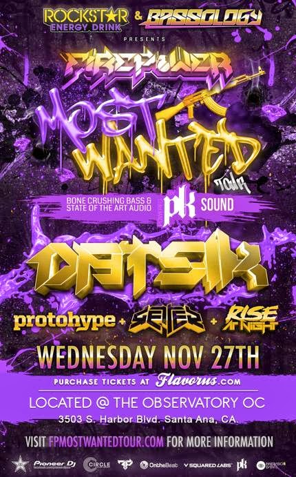Rockstar Energy Drink and Bassology are bringing the one and only dubstep master Datsik to the Observatory in Santa Ana tomorrow night on November 27. As part of Troy Beetles’ Firepower: Most Wanted tour, Protohype, Getter, and Rise At Night will also be performing at the Wednesday night show. With promises of bone crushing bass and state of the art audio powered by PK Sound, along with the all new Vortex Lumen whose visuals are provided by V Squared Labs, this all adds up to one heck of a night. Tickets are $28 as of now which is an amazing deal considering the guys you get to see.