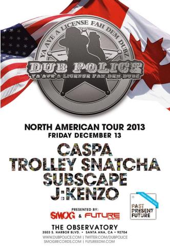 I predict that this Friday, December 13, an earthquake will be recorded due to the massive amount bass that will be provided by Caspa and Trolley Snatcha. The show, presented by Smog and Future Events, will be taking place at the Observatory in Santa Ana. Performing alongside the two UK residents will be label mates Subscape and J:Kenzo. The Dub Police North American Tour is currently making its way though Canada before making its way down south to the second to last stop of their tour. Tickets are $23 total as of now and doors will open at 10pm.