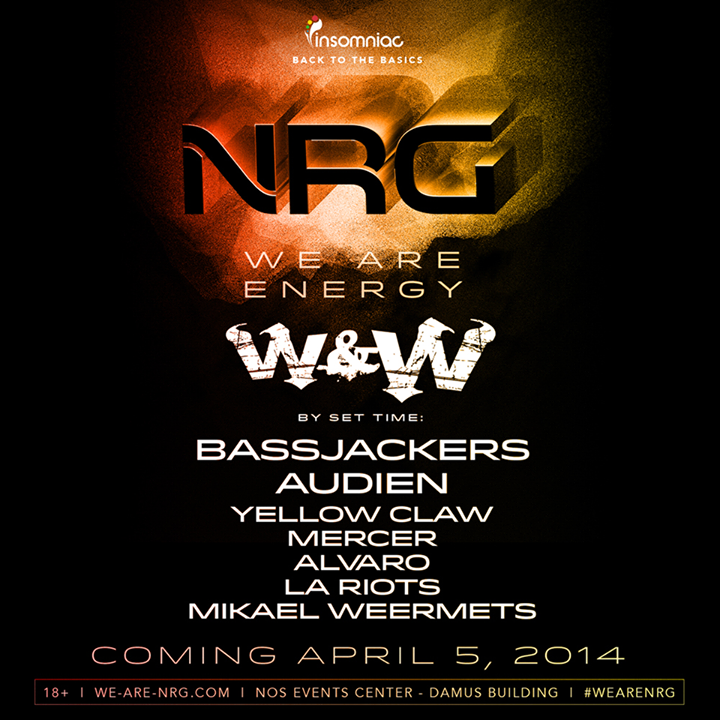 We Are NRG is the name of Insomniac’s new event that will be coming to the NOS Events Center in San Bernardino on Saturday, April 5. The lineup includes big names such as W&W, Bassjackers, Audien, and Yellow Claw. There will also be Mercer, Alvaro, LA Riots, and Mikael Wermets playing at the event.