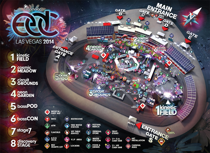 “Headliners, to help you make the most of your festival experience as you roam the colorful landscape, we’ve mapped out all the special details for this year’s event. The stages, carnival rides, the art installations, the lost and found, where to score free water and exclusive Insomniac gear; our festival map is a small but important luxury that we do just for you so you do not miss any of the attractions. We can’t wait for you to experience everything we have in store for you this year.”