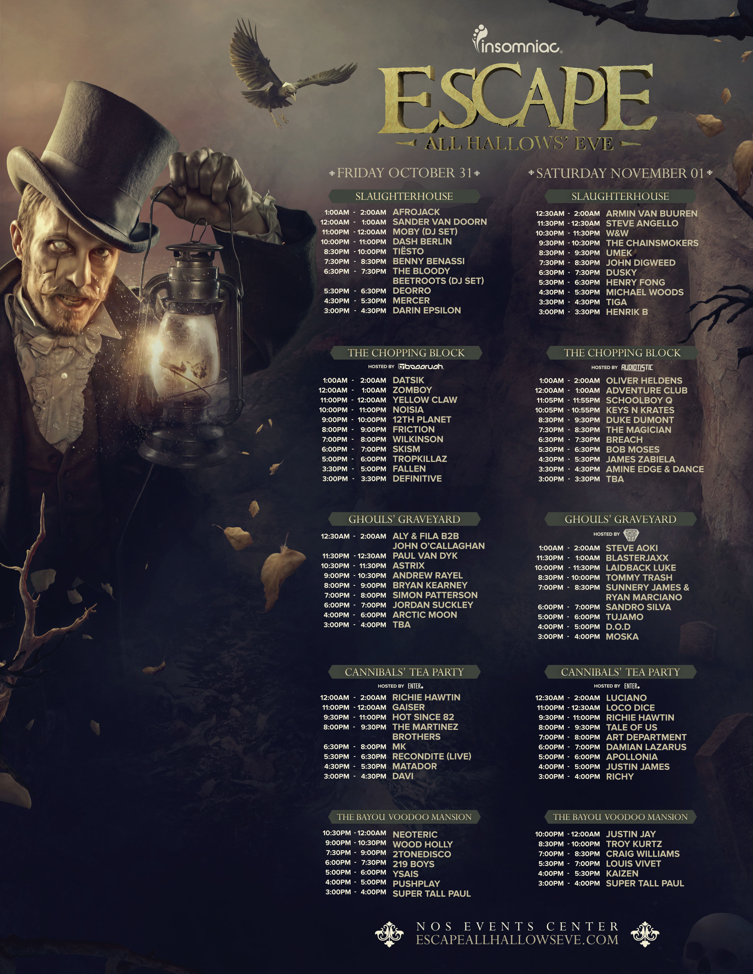 Insomniac’s massive festival Escape: All Hallows’ Eve is taking place this weekend on Friday, October 31st and Saturday, November 1st. The set times for each stage were recently released for the event at the NOS Events Center in San Bernardino. This years stages include Slaughterhouse, The Chopping Block, Ghouls’ Graveyard, Cannibals’ Tea Party, and The Bayou Voodoo Mansion.