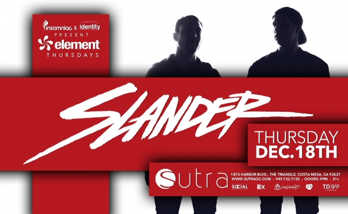 The crowd favorite duo of SLANDER will be playing at Sutra in Costa Mesa this Thursday, December 18th as part of the weekly Element Thursdays event. Derek Andersen and Scott Land just came out with their first original mix about a month ago called “Ascension” with NGHTMRE and already have another one on the way. Judging by the Facebook video the guys shared a few days ago, “Vanguard” has all the elements of what will amount to a classic SLANDER track: massive amounts of bass and some trap-tastic sounds. Tickets for the 21+ show are $20 with doors opening at 9pm.