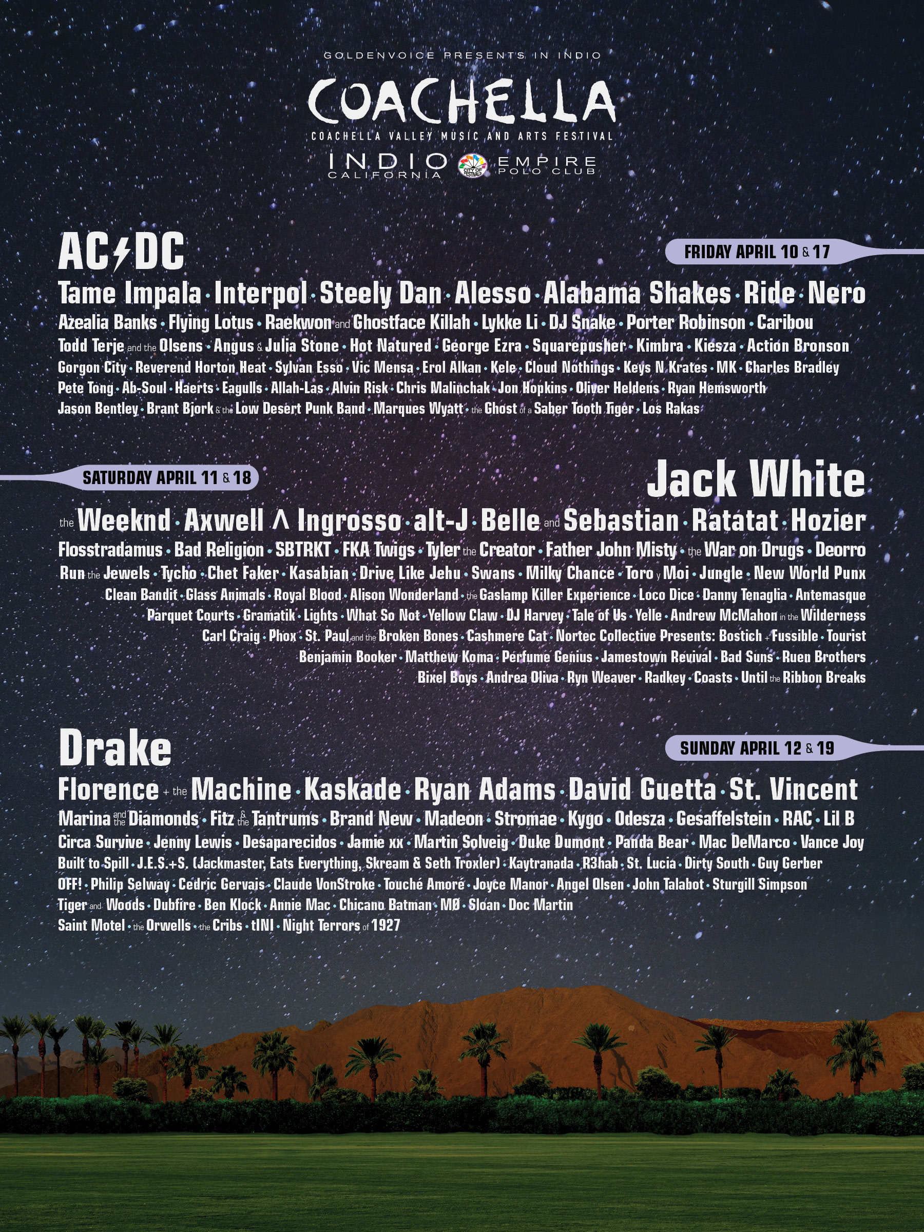 Other acts throughout both weekends include ACDC, Steely Dan, Jack White, The Weeknd, alt-J, Bad Religion, Kiesza, Florence + The Machine, and Ryan Adams.