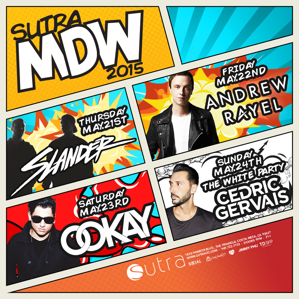 Memorial Day 2015 is shaping up to be a big one at Sutra, with four big names set to hit the stage over the course of this upcoming weekend. On Thursday, May 21st, local duo SLANDER will be playing their massive trap sounds at the Costa Mesa club with support from ARMNHMR, TRVTH OR DARE, and Adminh & Mizzo. Friday, May 22nd will see Andrew Rayel bring his progressive house and trance style to the stage. On Saturday, May 23rd, Ookay will take his place behind the decks alongside BB Guns and Marc Crenshaw. Sunday, May 24th is The White Party to cap off the weekend with Cedric Gervais. Doors open at 9m for all the 21+ shows with varying prices for each night.