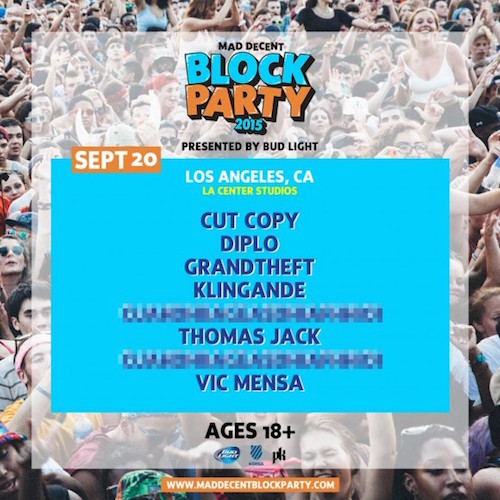 The following day on Sunday, September 20th will be the third and final Southern California show. Performers include Cut Copy, Diplo, Grandtheft, Klingande, Thomas Jack, Vic Mensa, and two other artists to be revealed later.
