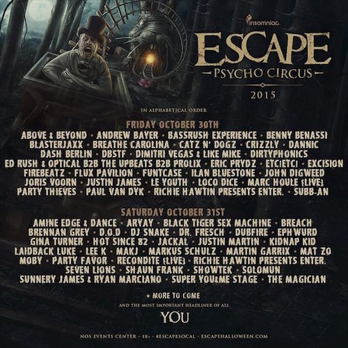 A few more names were just added to the lineup for Insomniac’s Escape: Psycho Circus a couple days ago. The annual Halloween event will be taking place Friday, October 30th and Saturday, October 31st this year. Tickets went on sale early last month and prices will rise once the date gets closer, so get yours early while you can.