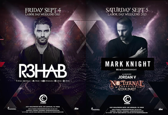 Create Nightclub will host R3hab on Friday, September 4th as part of their Noize Fridays. Saturday, September 5th will have Mark Knight perform in Nocturnal Wonderland’s After Party, alongside longtime resident DJ Jordan V.