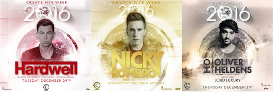 Create Nightclub, Los Angeles – Tuesday, December 29 – Thursday, December 31st: Three huge artists are coming to Create Nightclub for three amazing shows this New Years Eve. Hardwell will be on the decks Tuesday, December 29th; Nicky Romero on Wednesday, December 30th; and Oliver Heldens on Thursday, December 31st.
