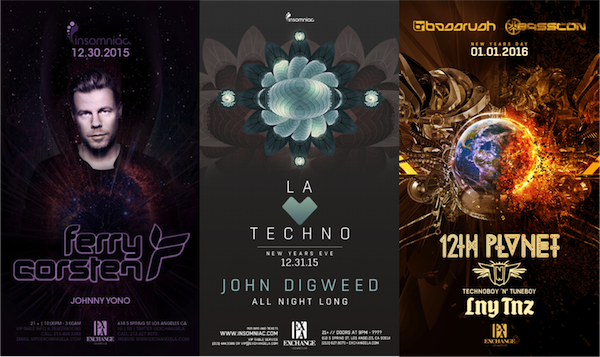 Exchange, Los Angeles – Wednesday, December 30th – Friday, January 1: Over the course of three days, Exchange LA will host trance, techno, and hardstyle/dubstep shows. Ferry Corsten will take the stage Wednesday, December 30th; John Digweed will ring in the New Year on Thursday, December 31st; and 12th Planet, Technoboy N Tuneboy, and LNY TNZ will duke it out on Friday, January 1st in Bassrush vs. Basscon.