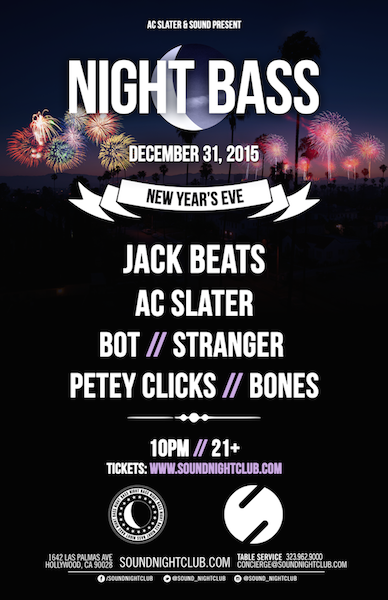 Sound Nightclub, Hollywood – Thursday, December 31st: AC Slater and his Night Bass brand will be taking over Sound Nightclub for New Years Eve. The stacked lineup also includes the likes of Jack Beats, BOT, Stranger, Petey Clicks, and Bones.
