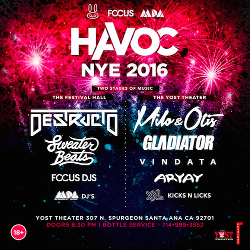 Yost Theater, Santa Ana – Thursday, December 31st: Yost Theater and Havoc Thursdays will be bringing out all the stops with two stages for their New Years Eve event. The Festival Hall will include Destructo, Sweater Beats, Focus DJs, and MDA DJs. Playing in The Yost Theater will be Milo & Otis, Gladiator, Vindata, Aryay, and Kicks N Licks.
