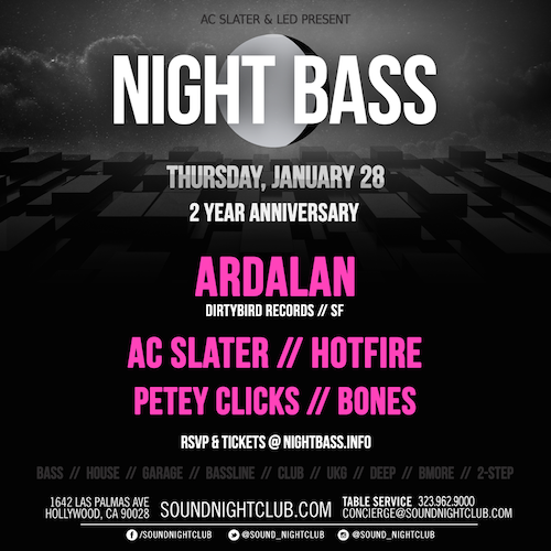 AC Slater’s Night Bass brand will be celebrating its 2 Year Anniversary this Thursday, January 28th at Sound Nightclub in Hollywood. Performing that night will be Ardalan from Dirtybird Records along with Night Bass artists HotFire, Petey Clicks, BONES, and of course AC Slater himself.