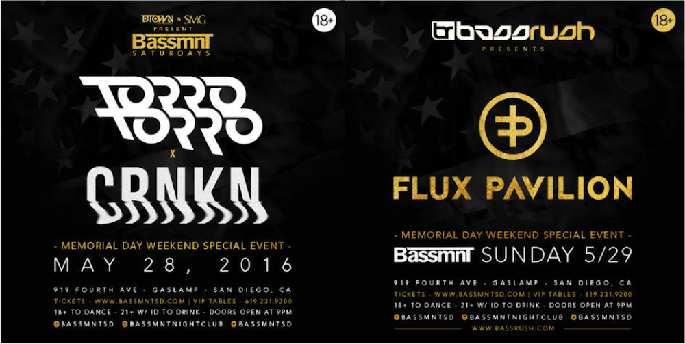 Bassmnt, San Diego: Torro Torro and CRNKN will be bringing the bass to Bassmnt in San Diego Saturday, May 28th. Dubstep don Flux Pavilion will be bringing his bass as well on Sunday, May 29th.