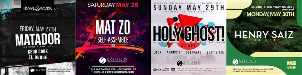 Sound Nightclub, Hollywood: Matador will be kicking off the weekend tonight alongside Kedd Cook and El Duque in his Ructions Album Tour. As part of his Self Assemble Tour, Mat Zo will be on the decks at Sound Nightclub in Hollywood on Saturday, May 28th. Sunday, May 29th will see a DJ set by Holy Ghost! with LBCK, Augustii, Bolivard, and Suit & Tie ins support. Henry Saiz will close the weekend out on Monday, May 30th.